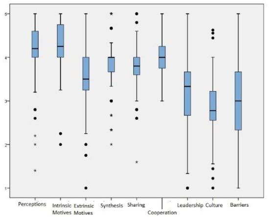 The estimate for the internal consistency of the entire questionnaire (Cronbach’s alpha) was 0.802. Each dimension had the following Cronbach’s α: perceptions—0.724, intrinsic motivation—0.626, extrinsic motivation—0.739, knowledge synthesis—0.652, knowledge sharing—0.570, cooperation—0.567, leadership—0.717, culture—0.821, barriers—0.664. Median, interquartile range, and outliers of the results from the nine dimensions of AKMI are presented in Figure 2, and the final version of AKMI with preliminary results is shown in Table 3.