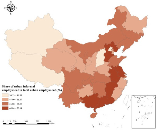 Geographical distribution of urban informal employment in 2010 in China.