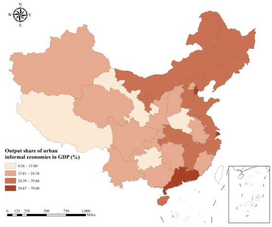Geographical distribution of urban informal economy in 2010 in China.