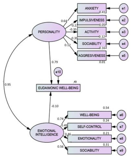 Personality proved to be an important factor for eudaimonic well-being (r = 0.79), which suggests that higher personality scores correspond to greater values of eudaimonic well-being. Meanwhile, emotional intelligence yielded a weak negative correlation (r = −0.10) with well-being, suggesting that higher EI values lead to lower eudaimonic well-being values. In addition, personality and TEI present a strong positive correlation (r = 0.95). Fit indices proved suitable for the model’s goodness of fit, which means that the three-factor model used is sustainable: χ2(9) = 9.312; p < 0.001; χ2/gl = 1.034; Confirmatory Fit Index (CFI) = 0.992; Normed Fit Index (NFI) = 0.977; Tucker–Lewis Index (TLI) = 0.979; Root Mean Square Error of Approximation (RMSEA) = 0.040, 95%CI (0.002–0.088).