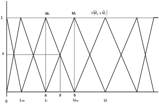 Step 2: Let us assume and are two TFNs, the degree of possibility of can be defined as given in Equation (6):