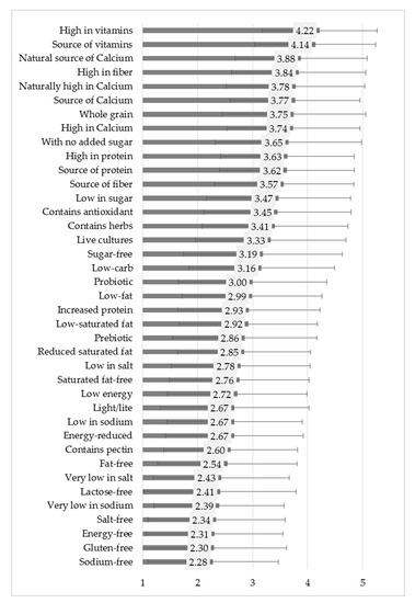 In general, nutrition claims related to vitamins and minerals received the highest preference scores. Protein, fiber and sugar content also seem to be important for the respondents. Claims related to fat content, energy, and salt can typically be found in the middle section of the list. PCA analysis clearly indicated a group constituted by those claims that are not listed in the Regulation (EC) No. 1924/2006 (Table 5). Lactose-free and gluten-free are at the bottom of the list. In terms of salt and sodium, the former one is more preferred by the consumers, although both terms indicate the same nutritional element (Figure 1).