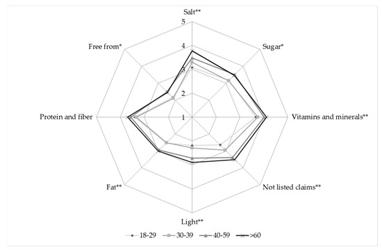 Preference of nutrition claims categories composed with PCA, between different age groups (* p < 0.05; ** p < 0.01).