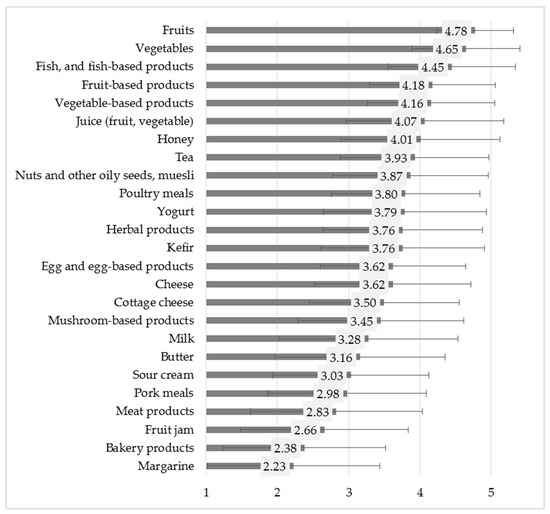 Previous studies highlighted the importance of the type of carrier food products regarding acceptance of health benefits by consumers [30,40,57,58]. During data collection, respondents could express their health-related preference about 25 types of foods on 1-5 Likert scale (Figure 3). Table 6 shows the 5 carrier categories composed by PCA.