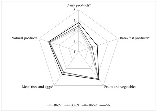 Differences between preferences of age groups are significant in cases of “dairy products,” “breakfast products,” and “meat, fish, and eggs.” “Fruits and vegetables” and “natural products” are fairly important for all age groups. Older adults preferred “dairy products” and “breakfast products” to a greater extent than others.