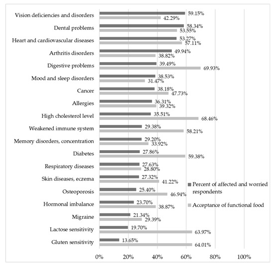 According to the results, the Hungarian population is mainly concerned/worried about the following health problems: vision deficiencies and disorders, dental problems, and heart and cardiovascular diseases. Results also highlight that diets containing functional foods for the mitigation and prevention of health problems are mainly related to digestive problems, high cholesterol level, lactose sensitivity, and gluten sensitivity according to the opinion of the respondents.