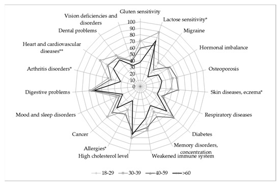 Proportion of affected/worried consumers in the age groups, who accepted food as a solution to prevent and/or mitigate a particular health problem (* p < 0.05; ** p < 0.01).