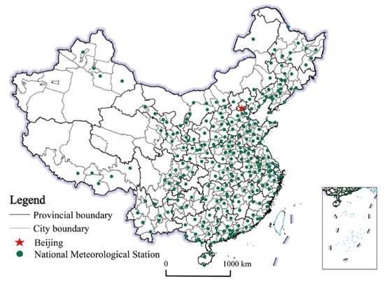 The temperature data used for the analysis of extreme heat hazard in this paper were from the dataset of daily climate data from Chinese surface stations for global exchange (V3.0) on the China Meteorological Data Service Center (http://data.cma.cn/en). We selected a national meteorological station in each city and collected daily maximum temperature data from 1960 to 2016. Because there are no national meteorological stations in 23 cities, or part of the annual data is missing, we used national meteorological stations data from adjacent cities to replace them. Finally, the daily maximum temperature data of 273 national meteorological stations from 1960 to 2016 were collected (Figure 2). The socioeconomic statistical data used for the analysis of exposure and vulnerability were derived from China City Statistical Yearbook (2017), the Sixth National Census of China (2010), and the statistical yearbooks of each city.