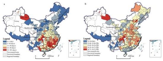Spatial distribution of urban hot days (a) and heat intensity (b) in China.