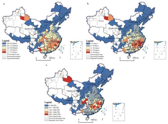 Spatial distribution of urban heat wave frequency (a), heat wave duration (b) and heat wave intensity (c) in China.