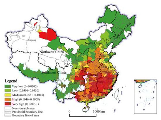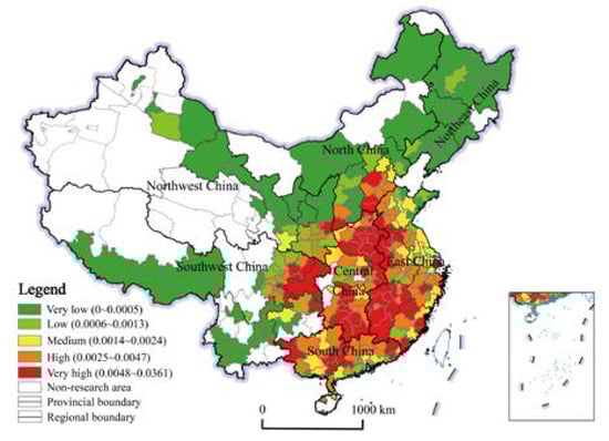 The EHRI of each city was calculated using Equation (5), and the values of EHRI were grouped into five categories using natural breaks method in ArcGIS software (Figure 7). The results show that the EHRI at the same level has obvious spatial agglomeration characteristics. Very high values (over 0.0048) of EHRI were found in 48 cities located in northeastern and southern Central China, southwestern East China, eastern Southwest China, and some cities in South China. High values (0.0025~0.0047) of EHRI were found in 58 cities concentrated in Central China, central East China, and central South China. Medium values (0.0014~0.0024) of EHRI were found in 64 cities concentrated in western Central China, coastal areas and northern South China. Lower values (0~0.0013) of EHRI were found in 126 cities located in Northeast China, Northwest China, Southwest China, and northern North China.