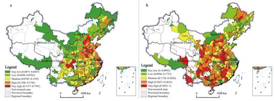 Spatial pattern of urban exposure index (a) and vulnerability index (b) in China.