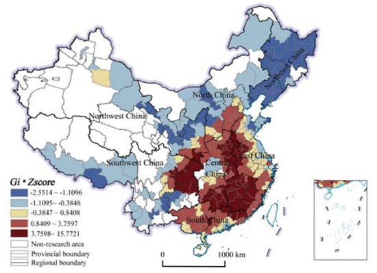 To reveal the variation in the EHRI spatial pattern, the Getis-Ord Gi* statistic for the EHRI of each city was calculated using the Hot Spot Analysis tool of ArcGIS. The Gi* statistic is a Z score that indicates where high or low EHRI values are spatially clustered [55,56]. If the Gi* is positive and statistically significant, the city is identified as a hot spot, which implies it is surrounded by other cities with high EHRI values. If the Gi* is negative and statistically significant, the city is identified as a cold spot, which indicates it is surrounded by other cities with low EHRI values. Figure 8 shows the results of EHRI hotspot analysis. The hotspot areas (values ranging from 3.7598 to 15.7721) are mainly concentrated in northern and eastern Central China, western East China, eastern Southwest China, and northeastern South China. The secondary hotspot areas (values ranging from 0.8409 to 3.7597) are mainly distributed around hotspots. The cold spots (values ranging from −2.5514 to −1.1096) and the secondary cold spots (values ranging from −1.1095 to −0.3848) are mainly located in Northeast China, Northwest China, and Southwest China.