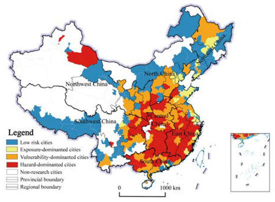 In terms of distribution of various types, the hazard-dominated cities are mainly located in East China, accounting for 47.5% of total hazard-dominated cities in China. The exposure-dominated cities are also mainly concentrated in East China, accounting for 52.9% of total exposure-dominated cities in China, mainly due to a large population in East China, accounting for 26.9% of China’s population. The vulnerability-dominated cities are distributed in all regions, with the largest number in Central China, accounting for 28.0% of total vulnerability-dominated cities in China. The low risk cities are mainly distributed in Northeast China, Southwest China, North China, and Northwest China, with the largest number in Northeast China, which accounts for 26.8% of total low risk cities in China.