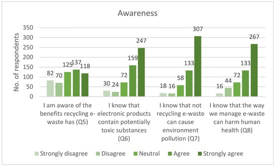 As for the awareness, it was observed that a great part of the respondents knew that the electronic products contain potentially toxic substances (76.32%) and that not recycling e-waste can cause environment pollution (82.71%). Even more, 75.19% of the respondents were aware of the fact that the way we manage e-waste can harm the human health. A lower percentage of respondents (47.93%) were aware of the benefits e-waste recycling can have—Figure 6.