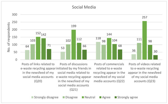 Besides the questions associated with these categories, some demographic data were also extracted, along with information related to ownership and knowledge of the e-waste products and the degree of usage of social media platforms, time spent on these platforms, and the degree to which the respondent can be influenced by the posts, videos, links, advertisements, and friends’ attitudes on these platforms. These questions allowed the respondents to choose one or more option from a list of possible options or asked the respondents to write their answers inside text fields.
