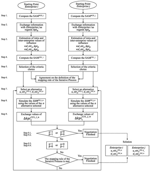 The negotiation process described to deal with the CS3 is depicted in Figure 7. NP_CS3 enables CN partners to jointly estimate influence values thanks to a full sharing of information, which includes the strategies formulated, the performance indicators, and the data related to such strategies and performance indicators. NP_CS3 will enable enterprises to negotiate the values of the decision variables , . Table 5 lists the parameters used in the NP_CS3. The steps to follow in the NP_CS3 are detailed in the following sections.