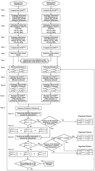 | Step 12.3. | Appraisal of alternative solution n provided by enterprise j If Enterprise i: and enterprise j: in the appraisal of alternative solution n selected by enterprise i If Enterprise i: and Enterprise j: and identify which alternative, the one proposed by enterprise i or the one proposed by enterprise j results on higher performance at network level () If a collaborative and negotiated solution is achieved in iteration m=n, given the proposal of enterprise i: , If a collaborative and negotiated solution is achieved in iteration m=n, given the proposal of enterprise j: , |