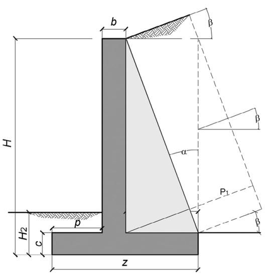 The design parameters of the problem are the data that will take constant values in the optimization process. The main design parameters are shown in Figure 3. H and H2 represent the wall height and the soil depth in front of the wall. The base coefficient of friction is represented by , the maximum support pressure for operating conditions is , and the backfill slope at the top of the rod is represented by . The maximum bearing capacity considered in the soil foundation is the ultimate bearing pressure divided by the bearing capacity safety factor. The pressure angle of the earth is determined by P (, , ), corresponding to the density, the angle of friction, and the angle of internal friction. Finally, a part of defines the roughness between the wall and the filling. The values of the problem design parameters are shown in Table 3.