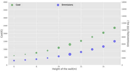 Variation and dispersion of average costs and CO emissions by the height of the wall.