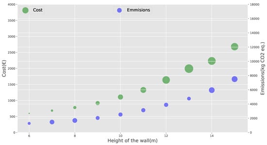 In this section, we will analyze the influence of wall height on the CO emissions and cost of the structure. The experiment consists of varying the height of the wall from 6 to 15 m with intervals of 1 m, keeping the rest of the parameters constant. For each height, the algorithm was executed 30 times, minimizing the cost. Subsequently, the same procedure was performed, but minimizing CO emissions. The results are shown in Figure 4 and Figure 5 as well as Table 4.