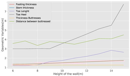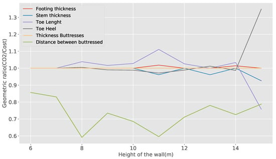 This section aims to study the variations of geometric, concrete, and steel variables when we perform cost and emission optimizations. In the first analysis, we will consider the geometric variables. The results are shown in the Figure 6 and Figure 7. In Figure 6, the optimal values of the geometric variables for different heights of the wall are shown. The figure shows that stem, footing, and buttress thicknesses suffer zero or small variations as the height of the wall increases. The toe and heel lengths increase as the height of the wall increases and the distance between buttresses oscillates. In Figure 7, we compare the optimal geometric variables when performing the optimization by emissions and cost. For this analysis, we define a geometric ratio that corresponds to the quotient between the value obtained in the emissions optimization and the value obtained in the cost optimization. The figure shows that most of the values are the same in both optimizations, except for the variable of distance between buttresses. For this variable, the value obtained from emission optimization is always lower than that obtained from cost optimization. Additionally, we observe that for the height of 15 m, the variables of toe and heel length are modified in an inverse way.