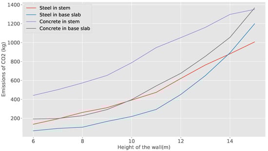 In the second analysis, the variables of concrete and steel are studied. Each of these variables are separated in the material used in the stem and in the slab base. Then, the CO emissions obtained from the optimization are calculated. The above is shown in Figure 8. The figure shows that for both concrete and steel, CO emissions increase as the height of the wall increases. However, the interesting thing is that this increase is not linear, as the height increases the slope of the emissions increases as well.
