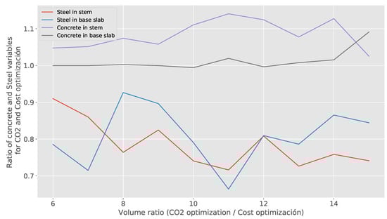 Figure 9 compares the optimal concrete and steel variables when performing the optimization by emissions and cost. In both optimizations and for the different wall heights, the concrete and the resulting steel in all cases were the C25/30 and BS500. In this analysis, we define a concrete volume ratio that corresponds to the quotient between the value obtained in the emissions optimization and the value obtained in the cost optimization. The figure shows that the emissions of concrete in the stem are higher in the case of emissions optimization than in cost optimization. However, this increase is offset by a decrease in emissions in steel, both in the stem and in the slab base. In Table 5, the values of concrete and steel are attached for both optimizations.