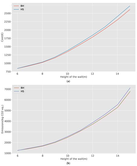 In Figure 10a, the best results for the BH and HS algorithms are compared. In the comparison, all parameters were kept constant except for height. From Figure 10a, it is observed that for small heights of the wall, the cost of the solutions obtained by both algorithms is similar. As the wall grows in height, the curves have a greater separation at the height of 14 m, which obtains the greatest difference, of 4.74% in favor of BH. In the case of optimization of CO emissions, in Figure 10b, the curves have behavior similar to that in the case of cost optimization. For small values of the wall height, very similar values are obtained and, in particular, at the height of 6 m, HS is greater than BH by 0.72%. As the height of the wall grows, the quality of BH solutions improves with respect to HS again at 14 m, where the greatest difference of 4.67% is obtained.
