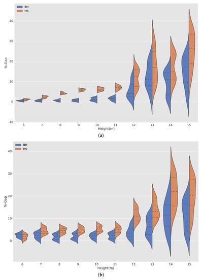 The comparison between the BH and HS solutions in the case of costs is shown in Figure 11a. In this Figure, it is observed, in the case of BH, it obtains better interquartile ranges than in HS for all heights. The dispersion of the solutions is very similar in both algorithms. From the height of 12 m onwards, the dispersion increases significantly in both algorithms. The solutions obtained from the optimization of CO emissions are shown in Figure 11b. Again, BH has a better interquartile range than HS, except for the height of 6 m. The increase in dispersion in both algorithms is observed from height of 12 m onwards.