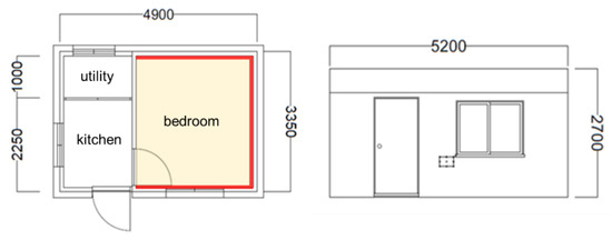 The target household is a recipient of the energy efficiency program supported by the Korea Energy Foundation. The target household is a 16.42 m2 sized studio located on the rooftop of a two-story detached house located in Gyeonggi-do, Korea. As shown in Figure 1, the target household is composed of a 10.5 m2 sized bedroom space and a 5.92 m2 sized kitchen and utility space. The target building was constructed with masonry walls and concrete slabs, and an approximately 1.6 m2 sized window is located in the bedroom. This building was constructed in 1997 and is a small studio.