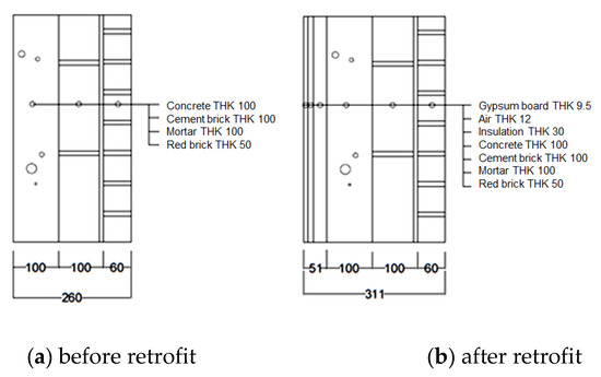 As shown in Figure 2 and Table 1, the wall before the retrofit works was composed of 50 mm redbrick, 10 mm mortar, 100 mm cement brick, 100 mm concrete, and no insulation. Through a retrofit project, an additional insulation reinforcement was conducted with a 30 mm thick insulation (extrude polystyrene), a 12 mm thick air layer, and a 9.5 mm thick gypsum board on the inside wall, according to the Building Design Criteria for Energy Saving (BDCES) in Korea. BDCES is a mandatory regulation for new construction building or retrofitted building projects in Korea and defines the insulation performance of the building envelope [25]. The existing wooden window was replaced by a Polyvinyl Chloride (PVC) window with excellent airtightness and heat insulation performance (Table 2).