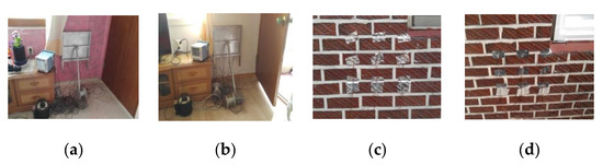 Figure 5. Wall thermal performance test. (a): Heat flux method test at before retrofit (inside); (b): Heat flux method test at after retrofit (inside); (c): Heat flux method test at before retrofit (outside); (d): Heat flux method test at after retrofit (outside).
