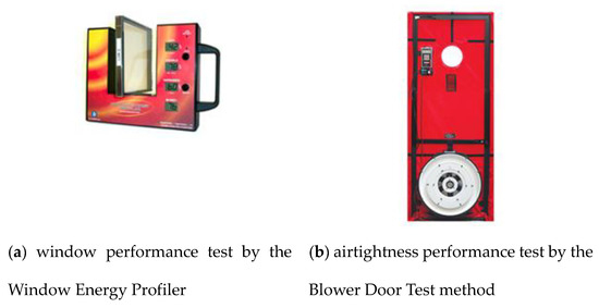 The window performances before and after the retrofit of the target building for the building energy performance were measured. The Solar Heat Gain Coefficient (SHGC) value, along with UV, visible light, and infrared transmission values were measured by the Window Energy Profiler (EDTM-WP 4200). The airtightness performance of the target building was measured through a Blower Door Test method. In the test, a blower door was installed at the door of the bedroom of the target building (Figure 6).