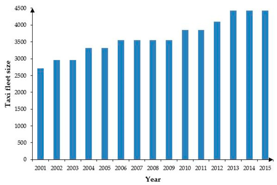 Many scholars studied the forecasting and monitoring of taxi fleet sizes [4], and proposed that the key adjustment indicators included: The taxi ownership per 10,000 people (the threshold is 20–30 cars per 10,000 people, not less than 20 cars per 10,000 people in big cities, not less than 5 cars in small cities, and medium values in mid-sized cities); the sharing ratio of taxis in public transport (between 10–20%), mileage utilization (60% for Shenzhen, 65% for Nanjing, 70% for Dalian); the average passenger waiting time (10 and 15 min in off-peak and peak hours in Zhejiang—the expectation value of Ningbo city is 6.72 min, and the actual value is 12.49 min, and 3.75 min for Dalian expectations); the income per 100 km or the average daily income of a taxi driver (related to the cost expenditure, business volume, and other factors); the traffic congestion index or the average waiting time of taxi’s carrying one passenger (no clear threshold value); the average daily carrying time of a single taxi (no threshold); and other indicators.