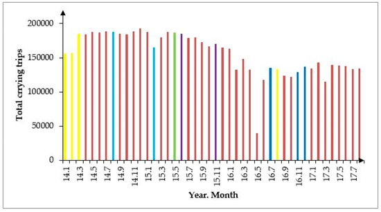 As shown in Figure 2, the monthly number of cruising taxi trips changed with Didi’s different marketing activities from 2014 to 2017. With the merge of the ride-hailing app Didi, the taxis were the only users of the apps and the taxi trips increased from 350,000 to 5,218,300 with the WeChat and Alibaba subsidy. However, after private car-hailing services were offered by Didi and other private ride-hailing car apps, the taxi trips decreased significantly. Until the regulations of the online ride-hailing and taxi were reformed, the ride-hailing cars were legal. After the new regulations were issued by China, the number decreased significantly and the taxi trips generally stabilized. For example, the numbers of private ride-hailing cars were 90,000 and 35,000 before and after the regulations were issued. The taxi trips fluctuated from 370,000 to 170,000.