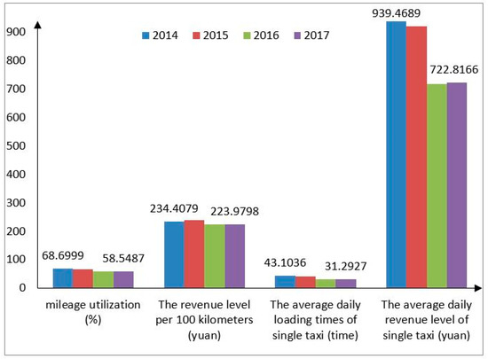As shown in Figure 3, the average daily mileage utilization decreased from 68.70% to 58.55%, a decrease of 14.78%. The average daily carrying times of single taxi declined from 43.10 trips to 31.29 trips, a decrease of 27.40%. The revenue level per 100 km decreased from 234.41 to 223.98 yuan per 100 km, a decrease of 4.45%. The average daily revenue level of a single taxi dropped from 939.47 to 722.82 yuan per car, a decrease of 23.06%. With the ride-hailing taxi’s rapid development, the operating efficiency of a single taxi decreased significantly. Thus, the influence of the private ride-hailing cars must be taken into consideration when the fleet size of the taxi is adjusted, and their business sharing ratio indexes are used to describe its effect.