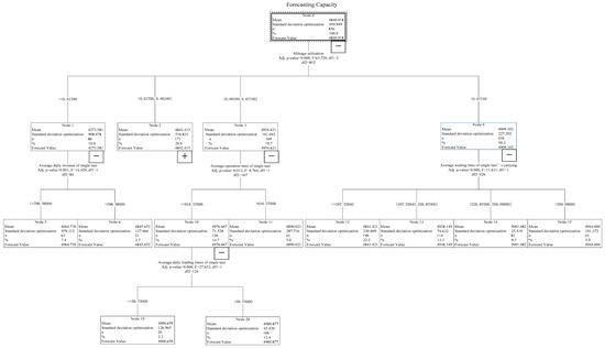 The mileage utilization has the strongest effect on the fleet size of taxis, and the F statistic was 63.73; followed by the average daily revenue of a single taxi, the average waiting time to catch a single taxi, the average operating time of a single taxi, and the revenue per 100 km. The F statistics decreased in the order, indicating that the effect of the indicators on the fleet size of taxis decreased. Finally, the average daily carrying times of a single taxi was chosen as the third layer of classification indicators. The p-value of each indicator in each layer was less than 0.05 and passed the significance test. The results of the tree structure analysis revealed the relationships, interactions, and the importance order among the influential indicators. Each threshold for each indicator in the tree structure clearly provided the adjustment criteria of the taxi fleet size.