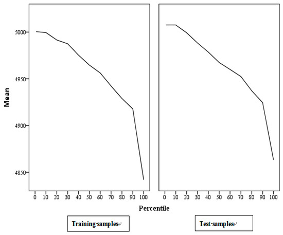 In addition, the cumulated distributions of the predicted values from the training dataset and testing dataset are shown in Figure 5. The variance and misjudgment rate of the estimated values were used to evaluate the risk of the regression tree model. The standard error of the training and testing dataset was 6.13%, and the misjudgment rate was 0.07. The overall accuracy of the model was better. The classification results can be used to guide the adjustment of the city’s capacity, as in theory the demand during peak and off-peak hours should be able to be improved and met with greater efficiency than the current market performance.