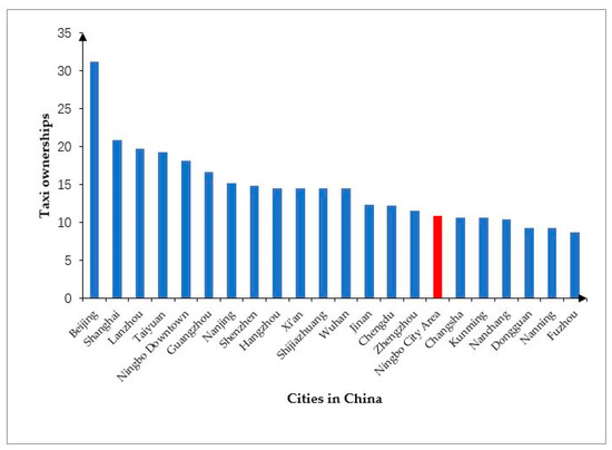 - The taxi ownerships per 10,000 persons directly reflected the relationship between the scale of the taxi capacity and the urban population. This is the earliest index for evaluating the status of the supply and demand equilibrium of the taxis to adjust the number of taxis in an urban area. For example, the Ministry of Transport of China regulated that the taxi ownerships per 10,000 persons should not be less than 25 taxis per 10,000 persons for a city of more than 100 million people. Although this indicator has no obvious significance, due to its lack of demonstrating taxi market performance, it is the most attentive value in the minds of the public and the media. The data of the taxi ownerships per 10,000 persons in many cities in China were collected. Compared with the other cities with a similar level of population, economic, and social development, the threshold of the taxi ownerships per 10,000 persons is suggested at 23 vehicles per 10,000 people recently in Ningbo. Please see Figure 6.