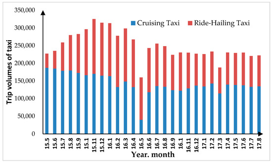 - The business ratio between the taxi and ride-hailing car describes the impact of the online ride-hailing car on the dropping effect of the cruising taxi trip. As shown in Figure 7, the comparison of business volume between the ride-hailing and cruising taxis was described. The business volume of the cruising taxi and online ride-hailing taxis reached a steady state until the regulations of the online ride-hailing taxi were proposed in June 2017. Therefore, the steady ratio of 10:6.54 is used as the threshold value of the sharing ratio between the cruising and ride-hailing taxis.