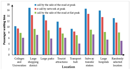 - The average waiting time of passengers reflects the satisfaction of the taxi service and the status of supply and demand. The higher passenger waiting time, the lower the satisfaction of the taxi service is. This also means that the supply of taxis is less than passenger demand. The average waiting time of passengers was investigated in different regions (Colleges and Universities; Large shopping districts; Large parks; Tourist attractions; Transport hub; Subway transfer station; Large hospitals; Randomly selected locations in addition to the above areas).