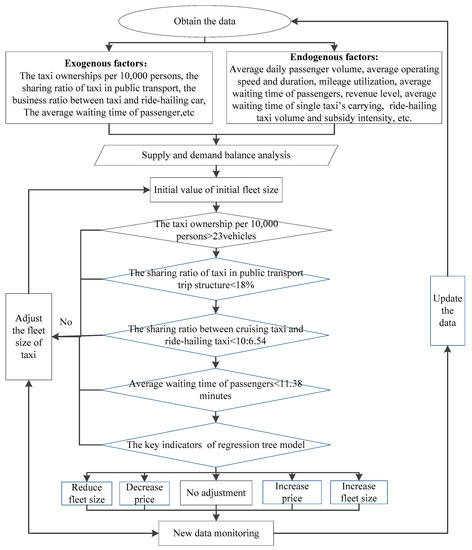 The objective of the taxi fleet size adjustment was to achieve the balance between supply and demand and reduce the taxi-hailing difficulty. The endogenous indicators were summarized in the regression tree model. However, the exogenous indicators were not considered in the model, and also had a significant influence on the adjustment of the taxi fleet size. The difference between the exogenous and endogenous indicators is the dataset. The exogenous indicators could not be collected in the operating datasets. As they reflect different relationships between the taxi fleet size and other influential factors, it is necessary to combine them into the dynamic adjustment mechanism.