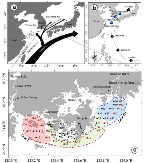 In the coastal waters of the southern part of Korea (such as Tongyeong, Geoje, and Busan), the physical water mass during the autumn and winter seasons is more strongly affected by the Jeju Warm Current and Tsushima Warm Current (TWC), both of which originate from the Kuroshio Warm Current (Figure 1a) [14,15,16]. The Tongyeong, Geoje, and Busan coastal areas, which are near the Kahwa Estuary and the Nakdong River Estuary, are located along the southeastern Korean Peninsula (Figure 1b). Numerous bivalve mollusks (oysters and ark shells) and fish farms have been established in these coastal areas. These aquaculture activities have led to the accumulation of organic matter in sediments, and this organic matter is one of the major non-point nutrient sources in these coastal waters. The Nakdong River is Korea’s longest river and the Nakdong Estuary is Korea’s second largest estuary [17]. In addition, the Nakdong Estuary neighbors the city of Busan, which has a population of about 4 million.