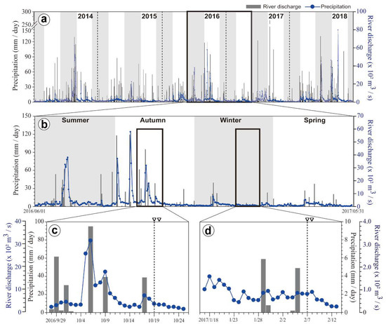 (a) Precipitation at Busan and the river discharge of the Nakdong River from 2014 to 2018. (b) Precipitation and river discharge from June 2016 to May 2017. (c) Precipitation and river discharge 3 weeks before and 1 week after the October survey. (d) Precipitation and river discharge 3 weeks before and 1 week after the February survey. Dotted lines in c and d indicate sampling dates.