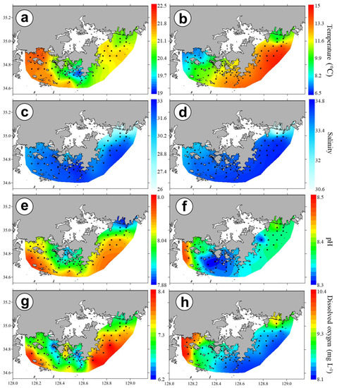 Horizontal distributions of temperature during (a) October and (b) February, salinity during (c) October and (d) February, pH during (e) October and (f) February, and dissolved oxygen (DO) during (g) October and (h) February. The contour maps were drawn using the software Surfer Version 12.