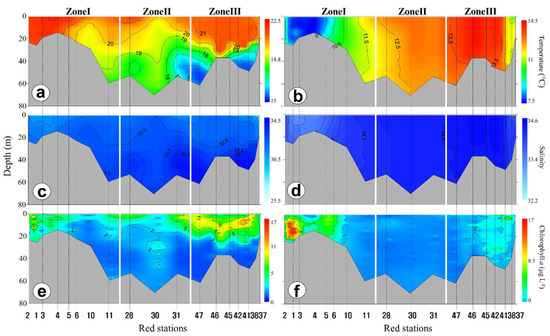 Vertical profiles of temperature during (a) October and (b) February, salinity during (c) October and (d) February, and chlorophyll-a (Chl-a) during (e) October and (f) February along the red stations shown in Figure 1c. The contour maps were drawn using the software Surfer Version 12.