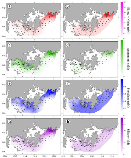 Horizontal distributions of inorganic nutrients; nitrate + nitrite during (a) October and (b) February, ammonium during (c) October and (d) February, phosphate during (e) October and (f) February, and silicate during (g) October and (h) February. The contour maps were drawn using the software Surfer Version 12.