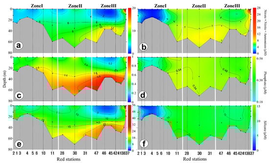 Vertical profiles of inorganic nutrients along the red stations shown in Figure 1c. Nitrogen (Nitrate + Nitrite + Ammonium) during (a) October and (b) February, phosphate during (c) October and (d) February, and silicate during (e) October and (f) February. The contour maps were drawn using the software Surfer Version 12.