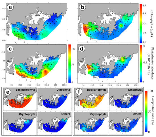 Horizontal distributions of Chl-a during (a) October and (b) February, total phytoplankton abundance during (c) October and (d) February, and specific horizontal phytoplankton classes (diatoms, dinoflagellates, cryptophytes, and others) during (e) October and (f) February. The contour maps were drawn using the software Surfer Version 12.